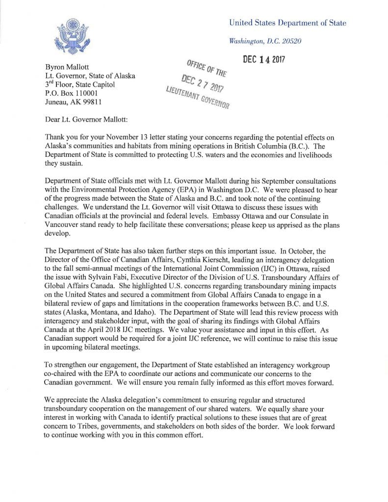 Then, the department sent a letter to Lt. Gov. Byron Mallott, who released it Dec. 28. He’s headed up the administration’s efforts to address potential pollution from mineral prospects across the border in British Columbia.