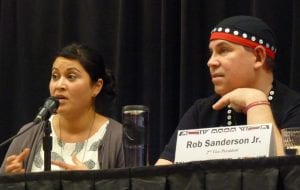 Mines adviser Barbara Blake and tribal leader Rob Sanderson Jr. participate in a forum March 9, 2016, in Juneau. (Photo by Ed Schoenfeld/CoastAlaska News)