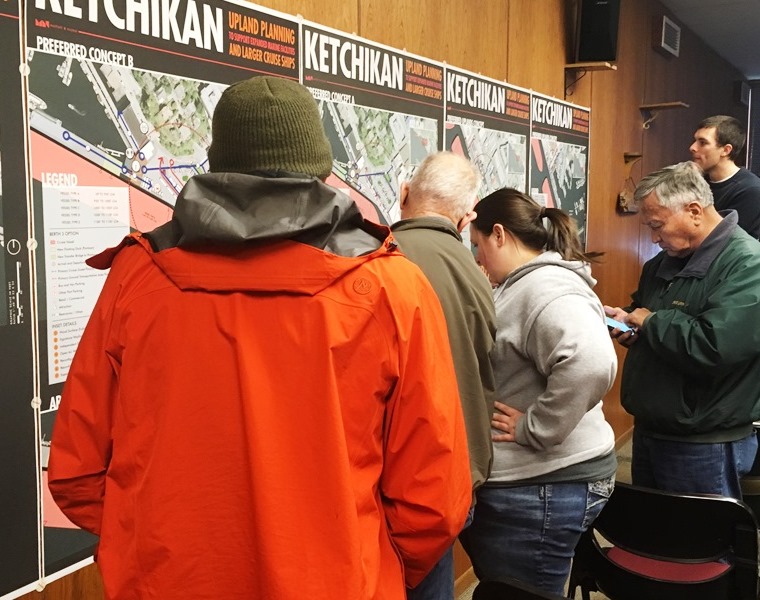 People look at design options for uplands development of Ketchikan’s port. (KRBD photo by Leila Kheiry)