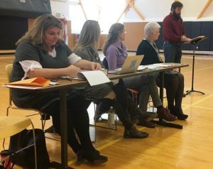 Emcee Jack Finnegan, standing, reads the rules before the start of the Ketchikan district spelling bee. Seated are the judges. (KRBD photo by Leila Kheiry)