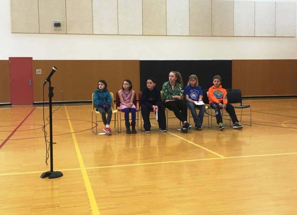 Six students who won their school bees wait for the district competition to start. They are Neila Urquhart , Myra McAlister, Maddox Davis, Grace Parrott, Annabelle Moore and Trevor Dash. (KRBD photo by Leila Kheiry)