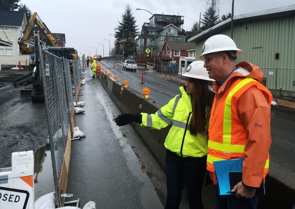 DOT Commissioner Marc Luiken talks with Project Engineer Mandi Pelhan about the ongoing Front-Mill-Stedman renovation project in Ketchikan. (KRBD photo by Leila Kheiry.)