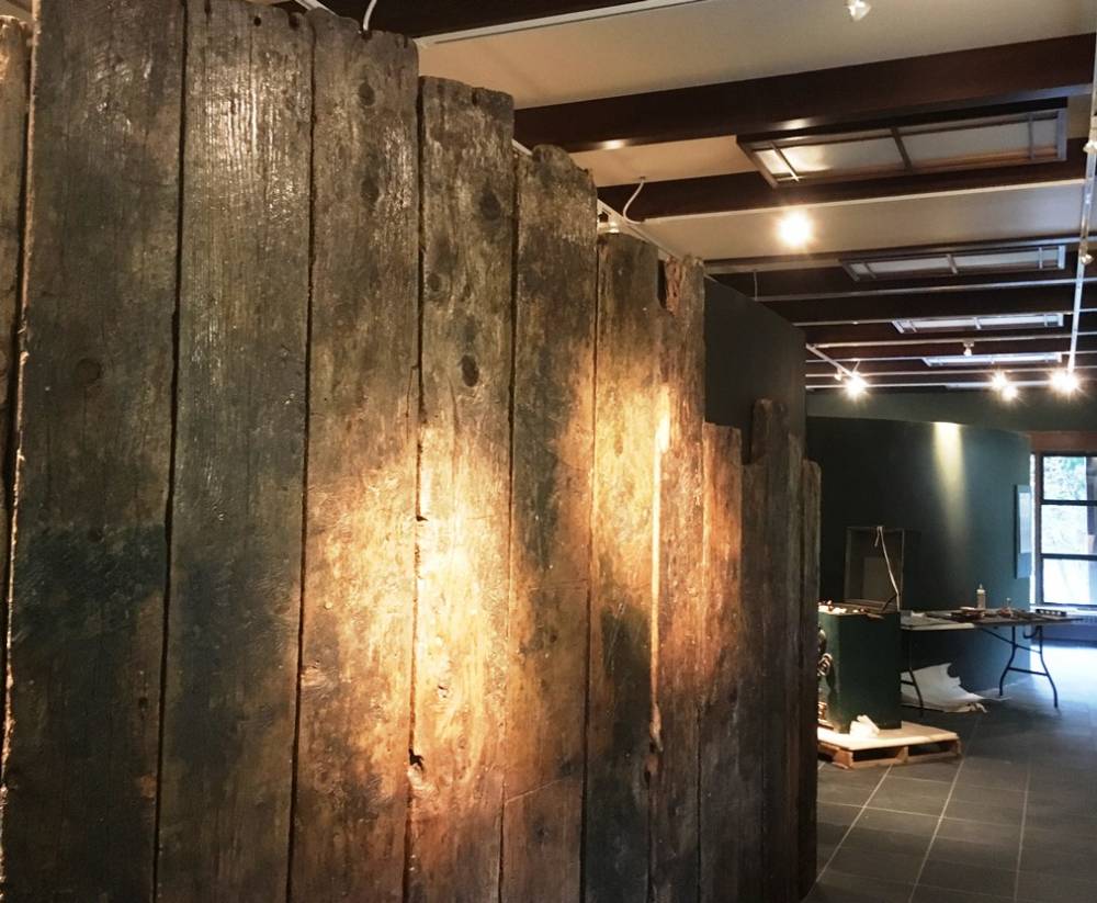 Salvaged boardwalk from Hopkins Alley lines some of the walls in the Tongass Historical Museum’s new permanent exhibit. (KRBD photo by Leila Kheiry)