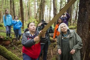 Delores Churchill watches her apprentice Kandi McGilton cut red cedar bark from a tree in Metlakatla. (Photo by Wayde Carroll)