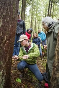 Delores Churchill instructs student Jamie Thompson on how to pull bark from a red cedar tree in Metlakatla. (Photo by Wayde Carroll)