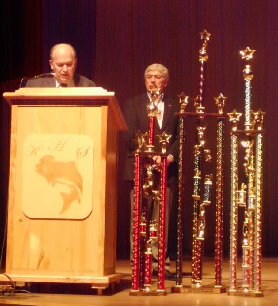 Governor Bill Walker reads a commendation during Kayhi’s AcDc assembly. Lt. Gov. Byron Mallot stands behind the team’s state championship trophies (KRBD staff photo by Maria Dudzak).
