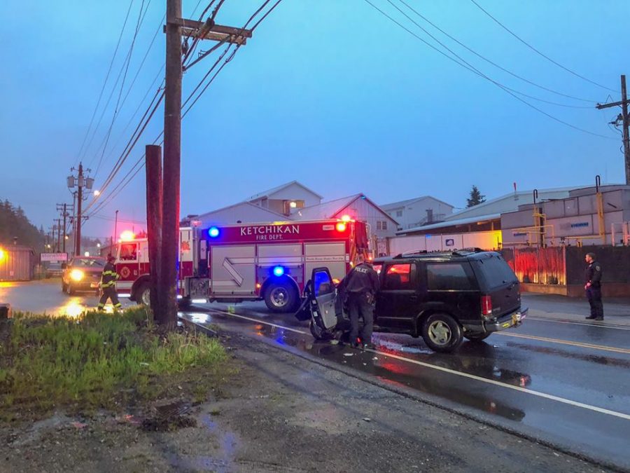 Two people were injured early Wednesday morning when the SUV they were in struck a pole. (Ketchikan Fire Department photo used with permission)