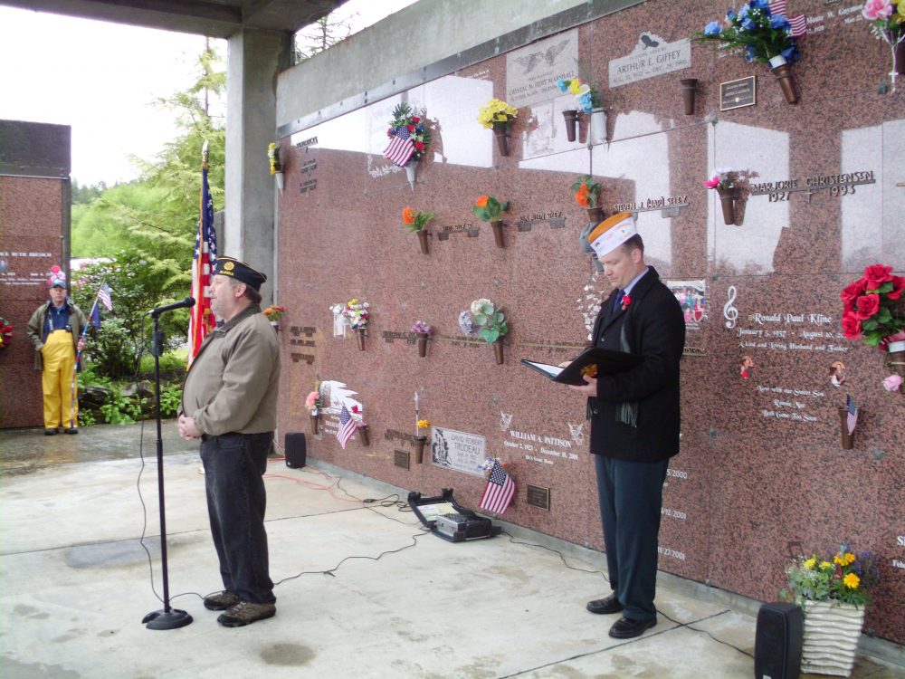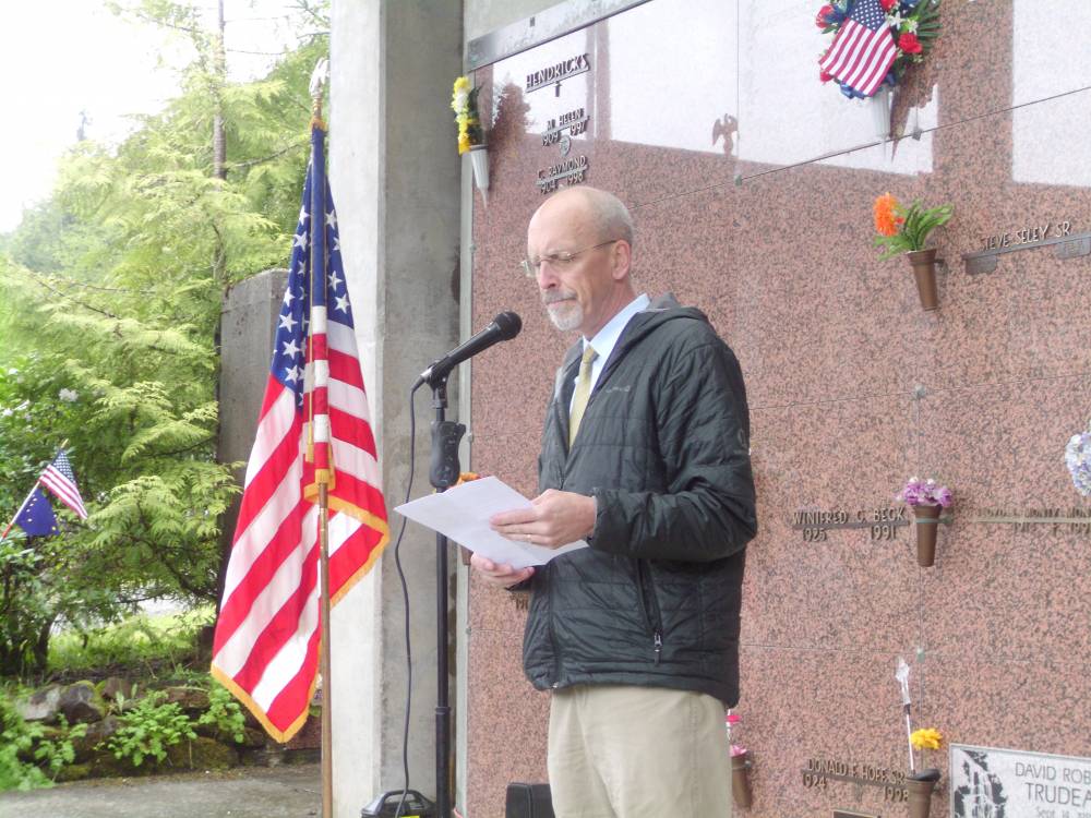 American Legion Post Commander Scott Klein (at microphone) addresses the audience at the Memorial Day ceremony. VFW Post Commander Paul Robbins, Jr. is pictured right (KRBD staff photo by Maria Dudzak).