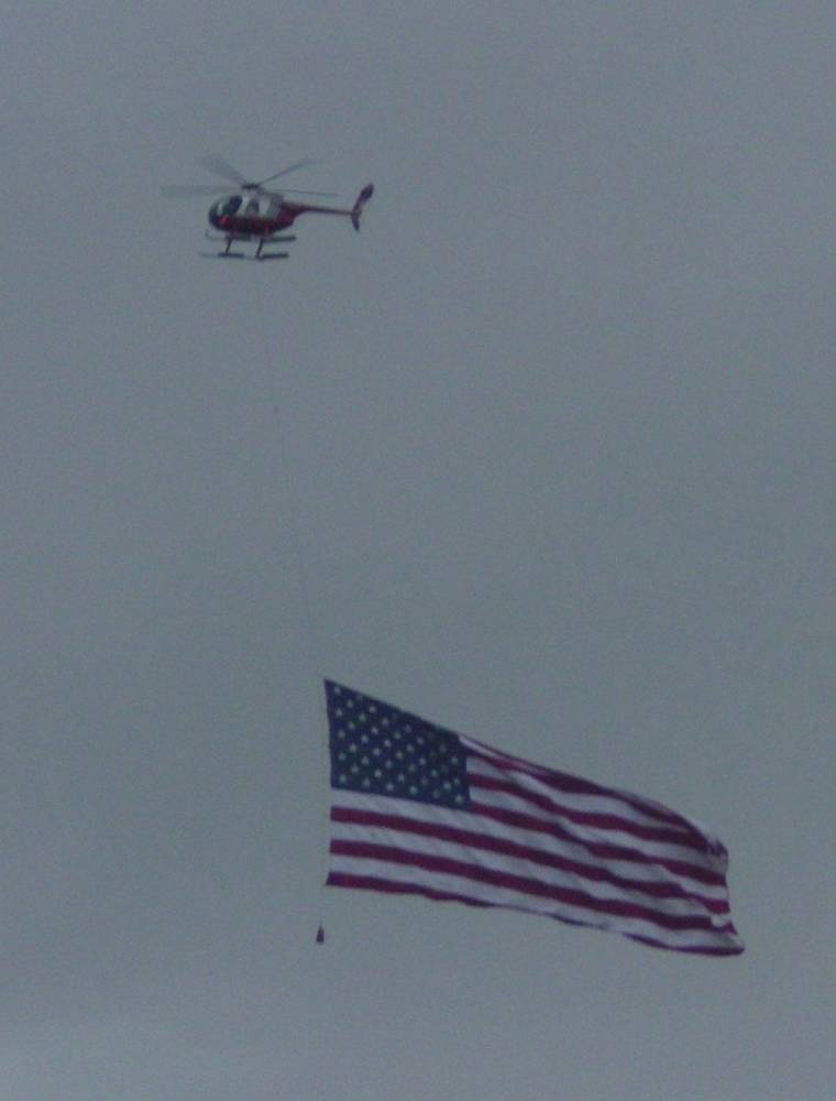Shortly after, a TEMSCO helicopter, pulling an American flag, flew overhead and hovered while guests joined in a reprise of the song and applauded.