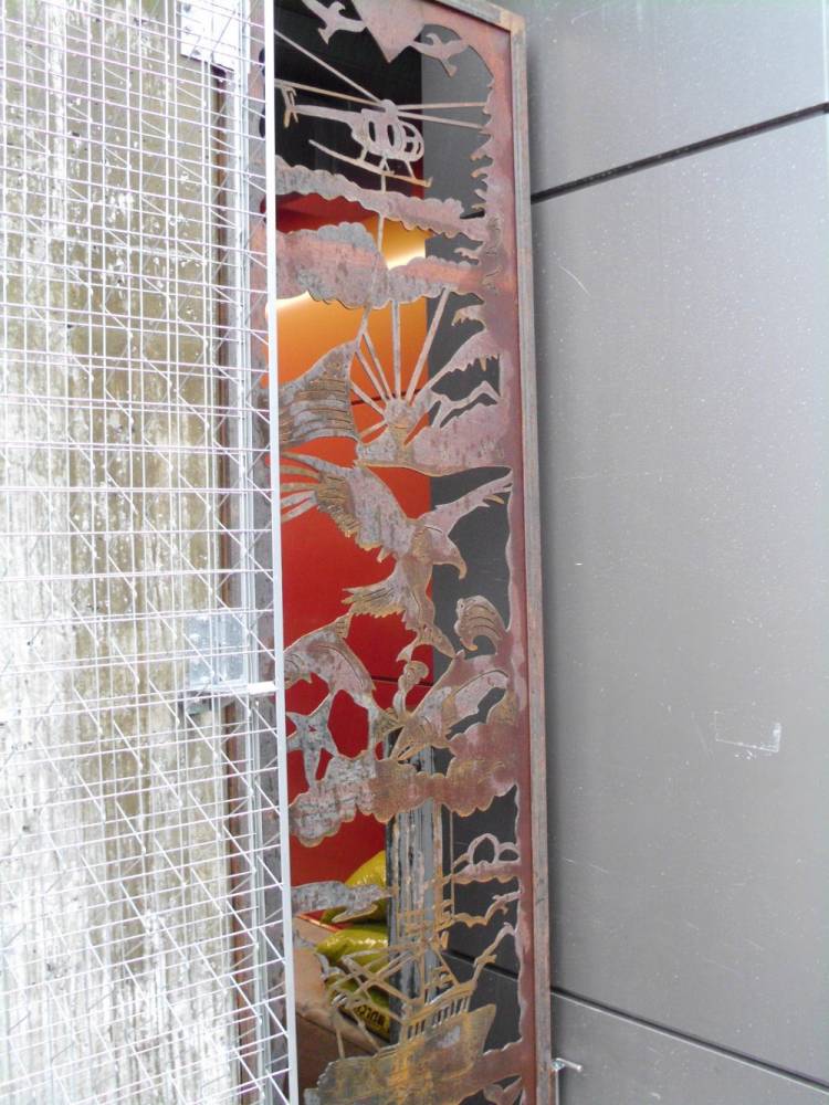 Eisenhower described the features of the garden. An iron gate created by artist Rhonda Green depicts a helicopter pulling the American flag. Ken Eichner began the tradition of flying the flag overhead at the start of Ketchikan’s 4th of July parade. Along with flower boxes, benches, tables and chairs, helicopter blades and booms are incorporated into the design. There are also glass awnings with overhead heaters.