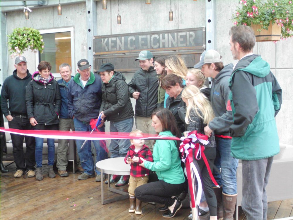 Several generations of the Eichner family gathered near the podium for the ribbon cutting. The honor was done by Karen Eichner.