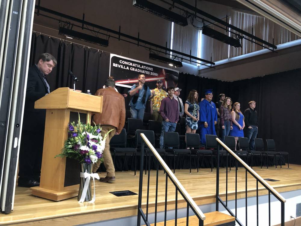 “We have one kid in a cap and gown, a couple kids in Hawaiian shirts, t-shirts, dress shirts, you name it. So it makes it kind of fun,” Revilla Principal Kurt Lindemann said.