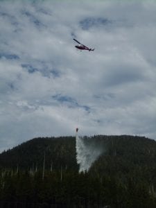 A Temsco helicopter makes a water drop over a small wildfire in Ketchikan (KRBD staff photo by Maria Dudzak).
