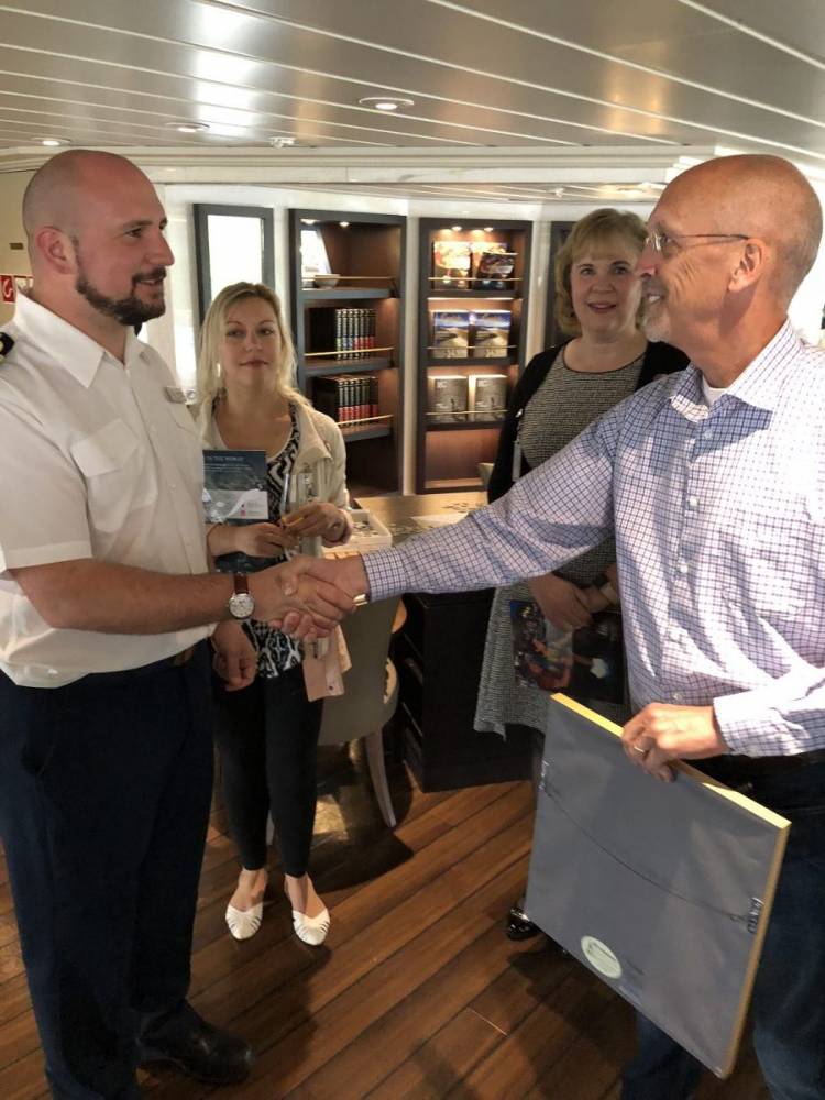 Ketchikan-Gateway Borough Mayor Dave Landis and Star Legend Captain Ned Tutton exchange ceremonial plaques.