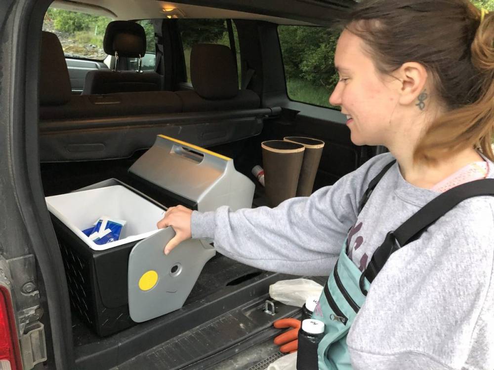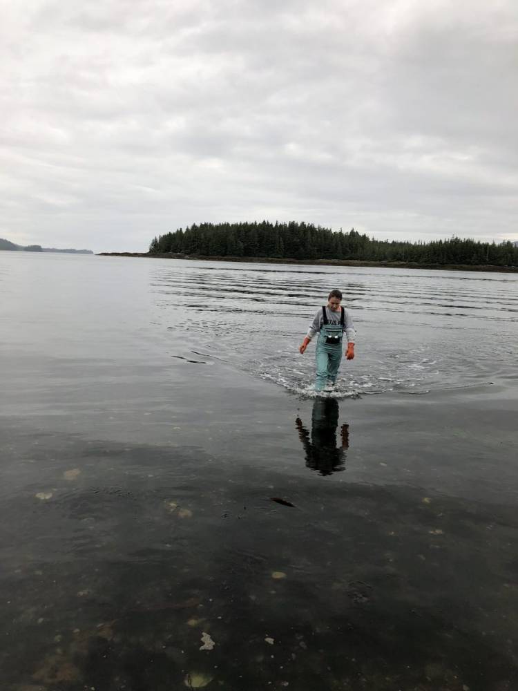 She’s at South Point Higgins, one of 11 beaches Forbes is testing this morning near Ketchikan. With her two bottles, she heads straight into the cold water.