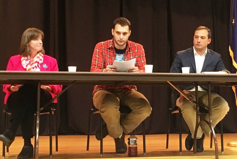 From left, Alyse Galvin of Anchorage, Christopher Cumings of Ketchikan and Dimitri Shein of Anchorage debate Friday in Ketchikan. Each seeks the Democratic nomination for U.S. House. (KRBD photo by Leila Kheiry)