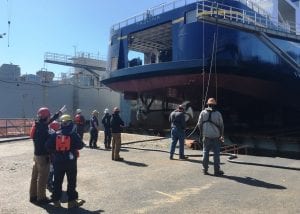 Vigor Alaska Ketchikan shipyard workers gather to watch the Tazlina get lowered into the water at the shipyard’s drydock in mid-May. A christening celebration was Saturday, and on Monday possible layoffs were announced. (KRBD photo by Leila Kheiry)