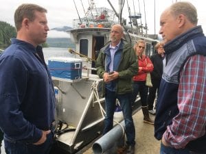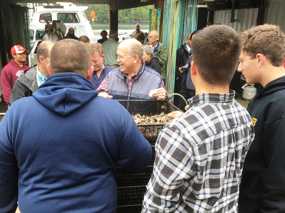 Trevor Sande, owner of Hump Island Oyster Co., (left) talks with Alaska Gov. Bill Walker about the farm. Also listening (center) are Ketchikan Gateway Borough Mayor David Landis and Julie Decker of the Alaska Fisheries Development Foundation. (KRBD photo by Leila Kheiry)
