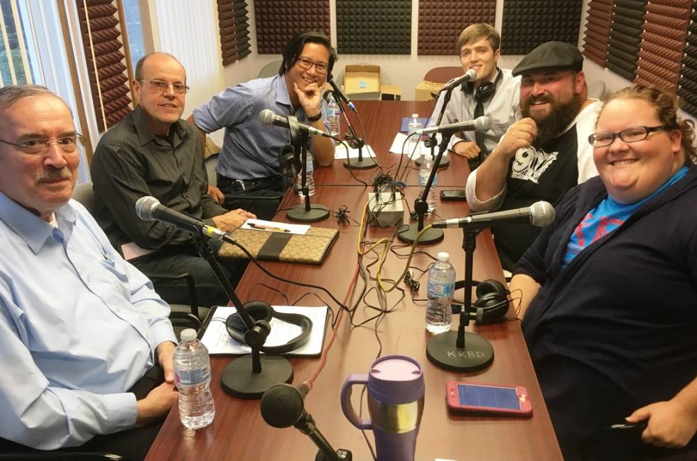 Clockwise from lower left are Ketchikan Gateway Borough Assembly candidates Dan Bockhorst, James Montgomery, Felix Wong, Austin Otos, Sven Westergard and Dani Pratt. They gathered Wednesday at KRBD for a candidate forum. (KRBD photo by Leila Kheiry)