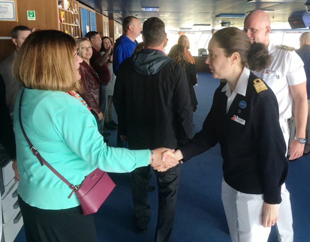 Captain Francesco La Fauci , hotel director Alina Chefneux, and staff captain Ivan Mladina welcomed delegates from Ketchikan onto the bridge of the Carnival Splendor during her inaugural visit to the First City.