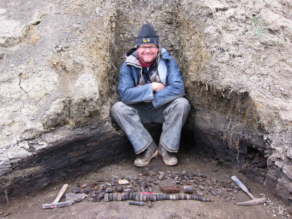 Paleo-botaniswt Kirk Johnson with a pile of juvenile duckbill dinosaur bones found on the Colville River. (Photo courtesy Ray Troll)