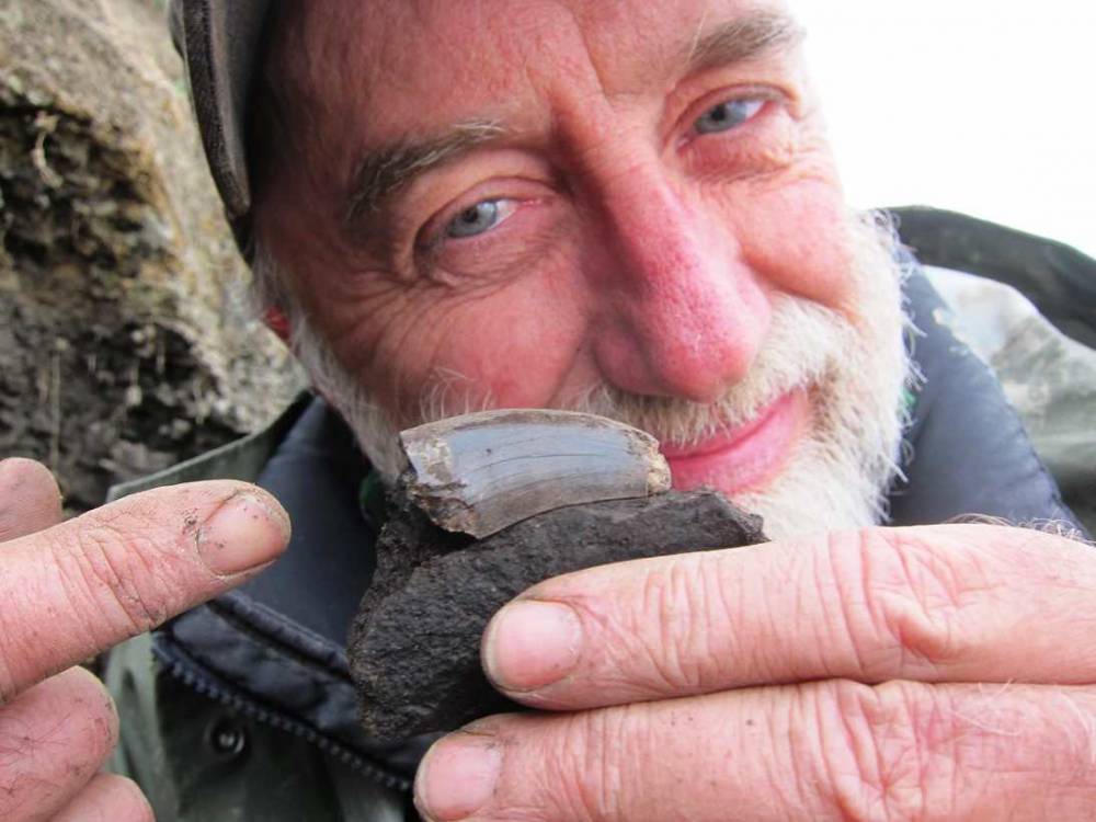 Ketchikan artist Ray Troll holds the Tyrannosaur tooth he found on the banks of the Colville River. (Photo courtesy Ray Troll)