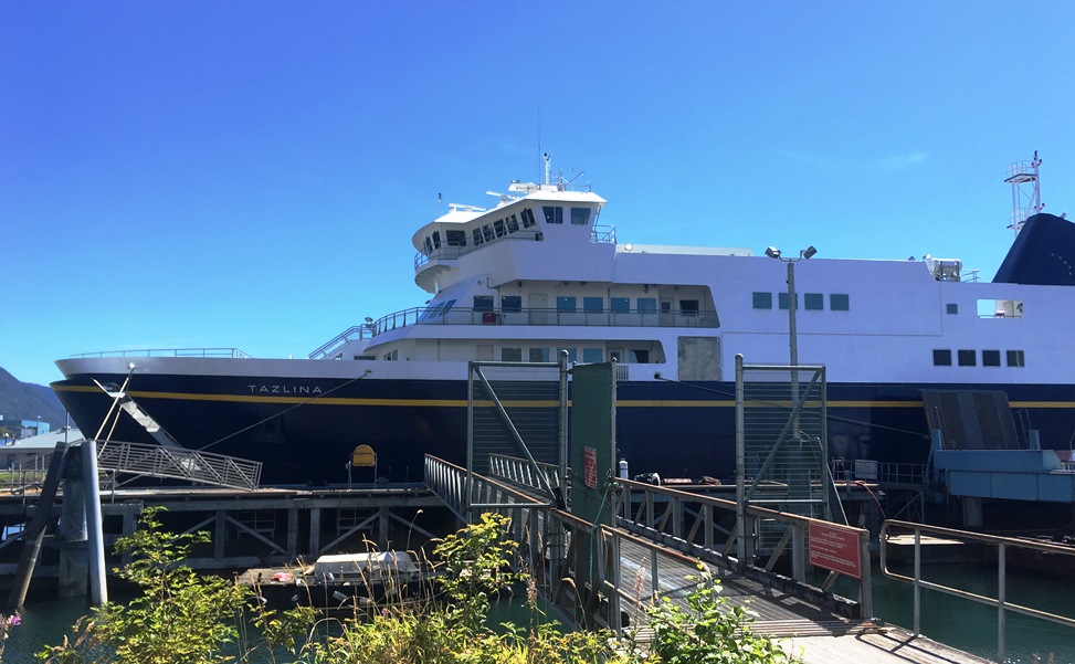 The Alaska Class Ferry Tazlina is at the Vigor Alaska Ketchikan shipyard in mid-August. (KRBD file photo by Leila Kheiry)