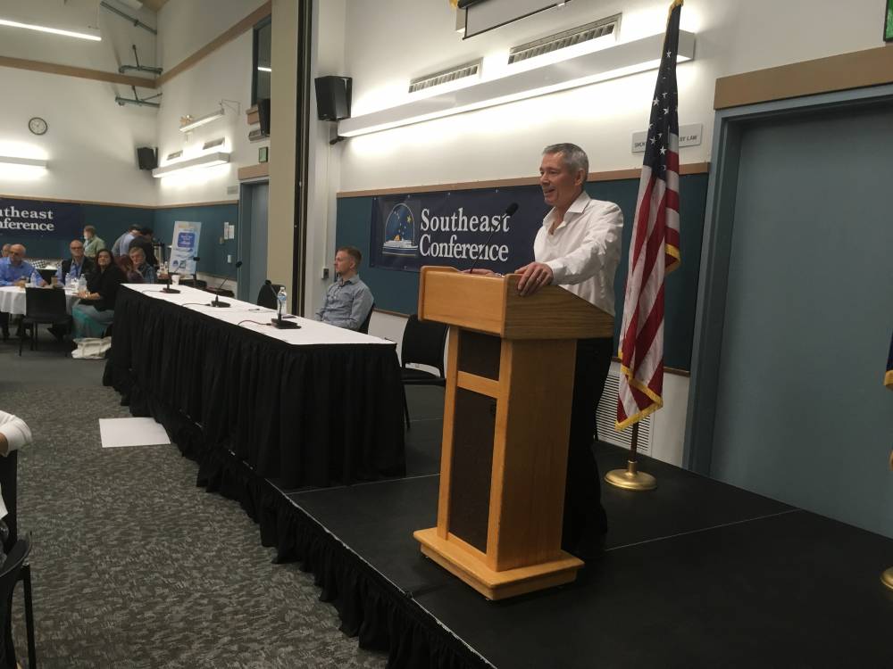 John Binkley talks about the cruise industry in Alaska during Southeast Conference’s fall 2018 meeting at Ketchikan’s Ted Ferry Civic Center. (KRBD photo by Leila Kheiry)