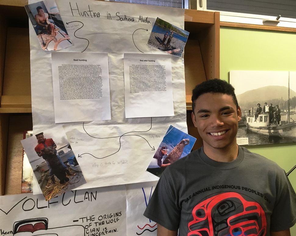 Students in the local Tribal Scholars program made posters for Indigenous People’s Day, celebrating an aspect of their Alaska Native culture. (KRBD photo by Leila Kheiry)