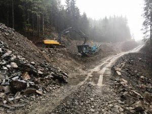 A rock crusher crushes shot rock, which will be used as fill on other sections of Shelter Cove Road. (KRBD photo by Leila Kheiry)