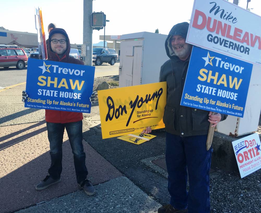 Republican Trevor Shaw, left, was waving campaign signs with supporters at the corner of Jackson and Tongass on Election Day. (KRBD photo by Leila Kheiry)