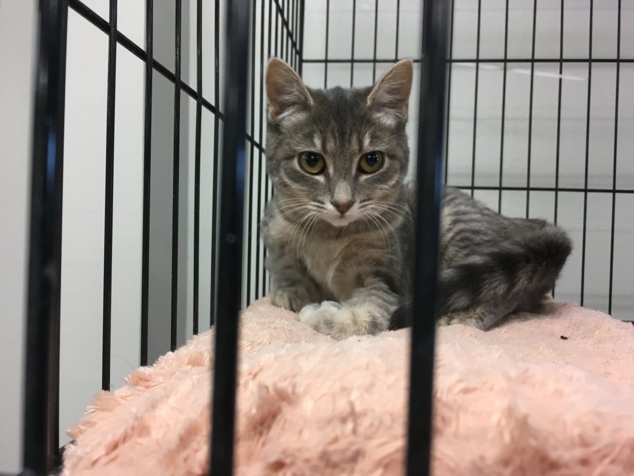 A cat rests in its cage in the upstairs cat area of the Ketchikan animal shelter. (KRBD file photo by Leila Kheiry)