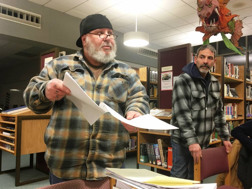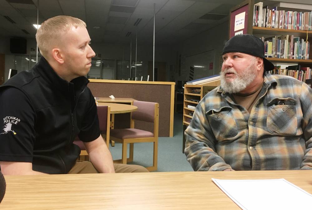 Terry Miles, left, and Paul Bermudez have organized Ketchikan’s first Neighborhood Watch, for the area of lower Jackson Street and Upper Monroe. The group had an informational meeting on Wednesday at the Ketchikan High School library. (KRBD photo by Leila Kheiry)