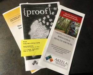 First City Players production of Proof in Ketchikan was sponsored by Akeela Gateway, a mental health and substance abuse treatment nonprofit. (KRBD photo by Leila Kheiry)