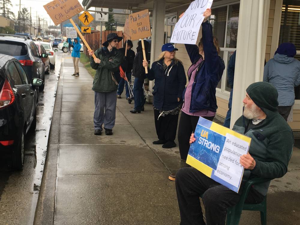 One of the picketers standing in the cold and blowing rain was Frankie Urquhart. Her handmade sign read: Fund Our Future.