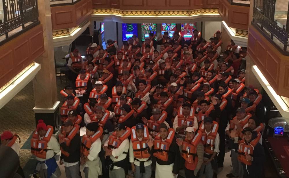 While we walked around, the crew practiced a fire safety drill. Crew members in orange life jackets mustered throughout the ship.