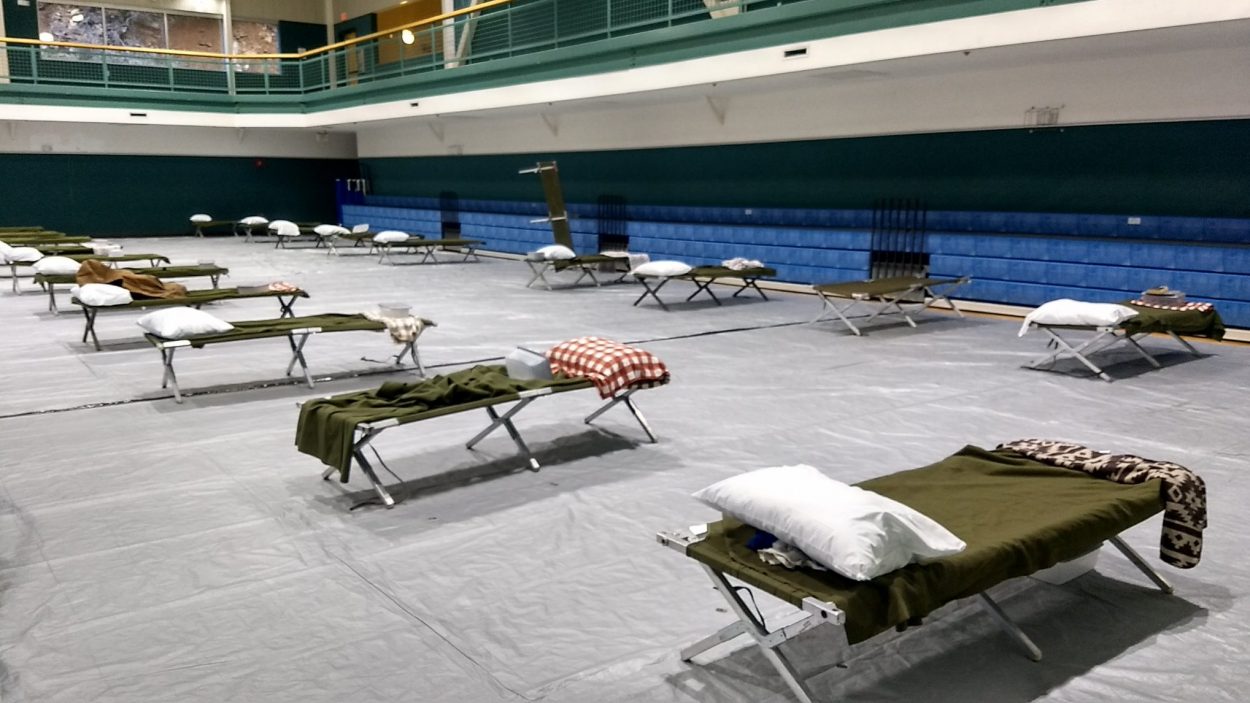 Cots occupy a basketball court at Ketchikan’s Gateway Recreation Center Thursday. (Photo courtesy Donita O’Dell)