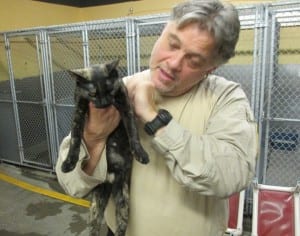 Eddie Blackwood, the borough’s animal protection department director, pets one of the adoptable cats available at the shelter in this 2014 file photo. (Leila Kheiry/KRBD)