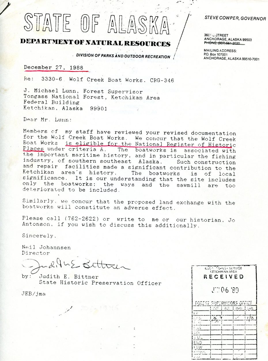 “Sen. Murkowski is aware of the issue concerning Wolf Creek Boatworks, and expects the Forest Service to properly address any historic structures at the site,” spokeswoman Grace Jang wrote in a statement.