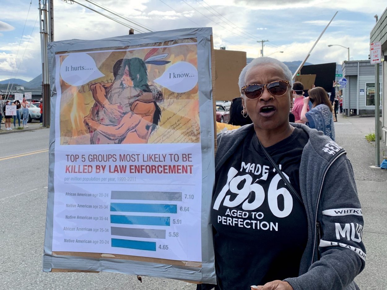 Harmila Earth was one of many protesters carrying signs expressing solidarity between Ketchikan’s black and Alaska Native communities. (Eric Stone/KRBD)