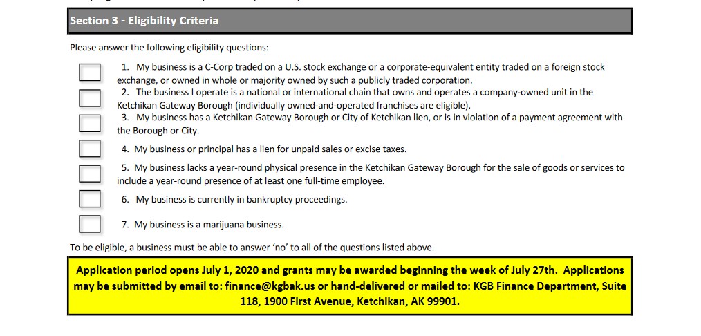 Applicants must answer “no” to every question on the two-page Ketchikan business assistance application to be eligible. (Screenshot by Eric Stone/KRBD)