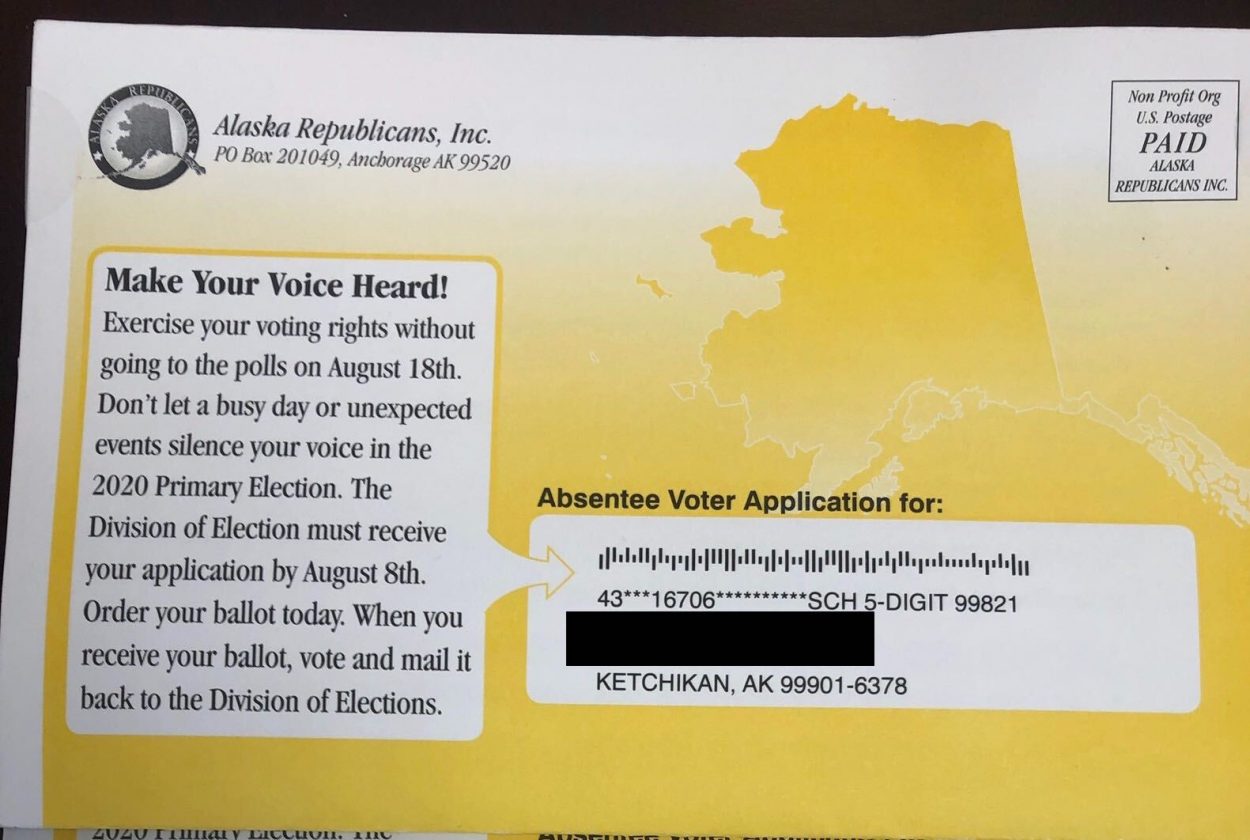 He says the Alaska Republican Party typically sends absentee voter applications to reliable Republican voters to encourage them to turn out. The mailings are unrelated to the state’s effort to mail absentee voting applications to Alaskans over 65, a move that recently landed the state in court.