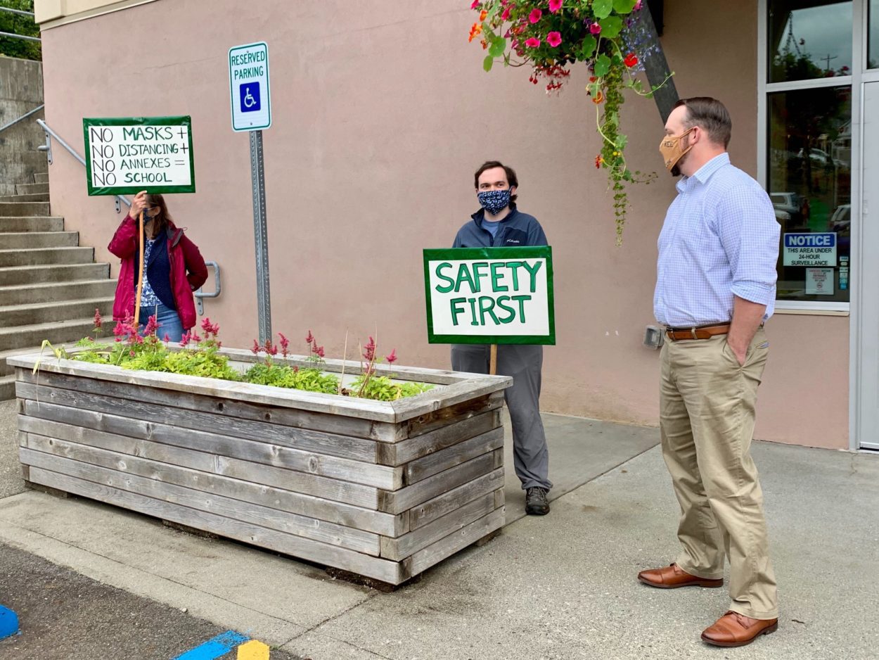 Ketchikan School Board member Paul Robbins, Jr., right, speaks with teacher and Academic Decathlon coach Peter Stanton, middle, prior to an Aug. 12 board meeting. Teachers gathered to ask board members to approve pandemic safety measures for the upcoming school year as Ketchikan’s students return to classes five days a week. (Eric Stone/KRBD)
