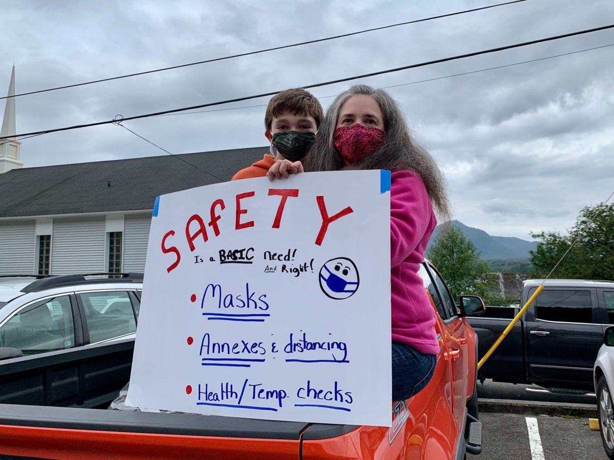 Special education teacher and mom Gale Lindemann, right, sits with her son, August outside the Aug. 12 Ketchikan School Board meeting. The pair was there to advocate for pandemic safety measures as Ketchikan’s students return to classrooms five days a week. (Eric Stone/KRBD)
