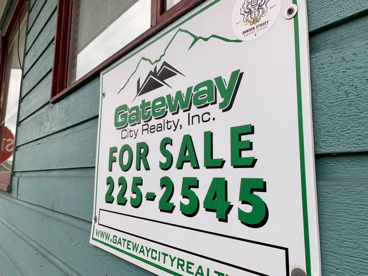 A “for sale” sign stands on a building in downtown Ketchikan Tuesday. While transactions are down for the year so far, bankers and brokers are having a busy summer with interest rates at historic lows. (Eric Stone/KRBD)