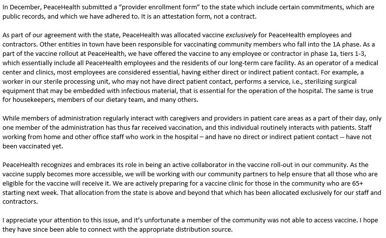 PeaceHealth defended its decision to inoculate its day care coordinator — the hospital argues he has “indirect exposure” by supervising the children of doctors and nurses who work on the front lines. Hospital housekeepers, food service staff and employees that sterilize hospital equipment also have the potential for indirect exposure and were eligible for the initial wave.