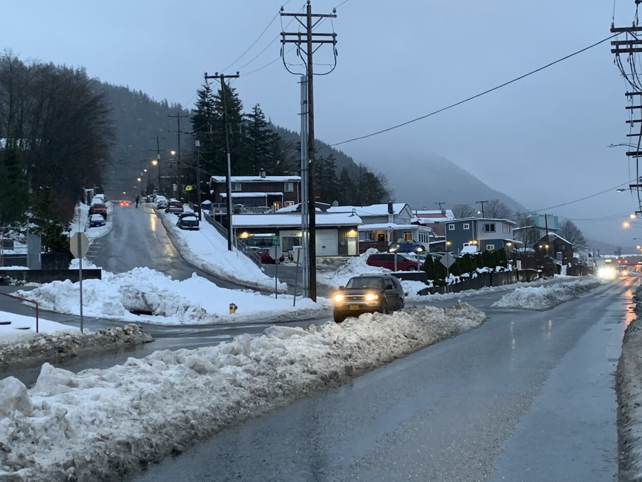 Snow berms, a somewhat rare sight in Ketchikan, persisted Monday even after snow turned to rain. (Eric Stone/KRBD)