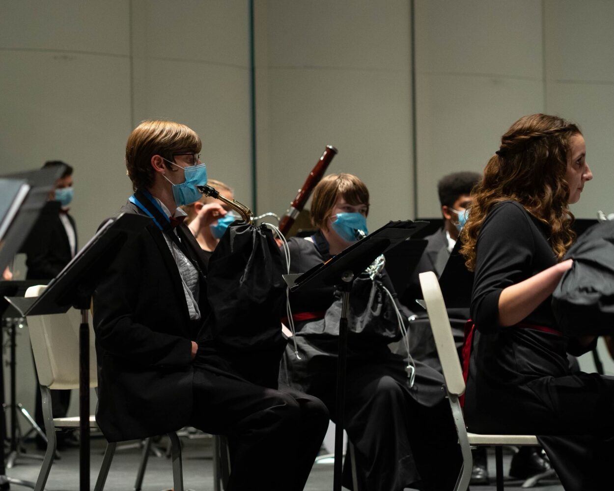 Clark, left, plays saxophone through a mask and a mesh bag during a band concert. (Courtesy of Clark)