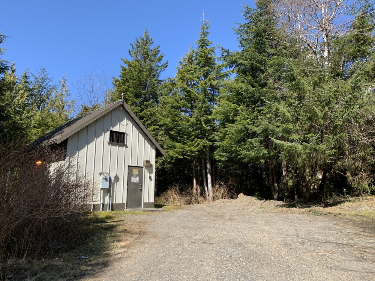 A Ketchikan Public Utilities networking facility sits at the end of Shoup Street in the Saxman area. Until recently, SpaceX was in talks with the city to lease a portion of the land near the facility to host a ground station for its Starlink internet network, but the borough planning commission declined to authorize a key permit for the site Tuesday after hearing objections from neighbors. (Eric Stone/KRBD)