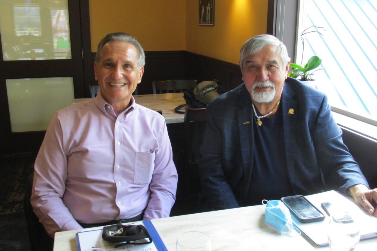 Lt. Gov. Kevin Meyer (left) and Bill Thomas at a press conference in Ketchikan April 22 (KRBD staff photo by Maria Dudzak).